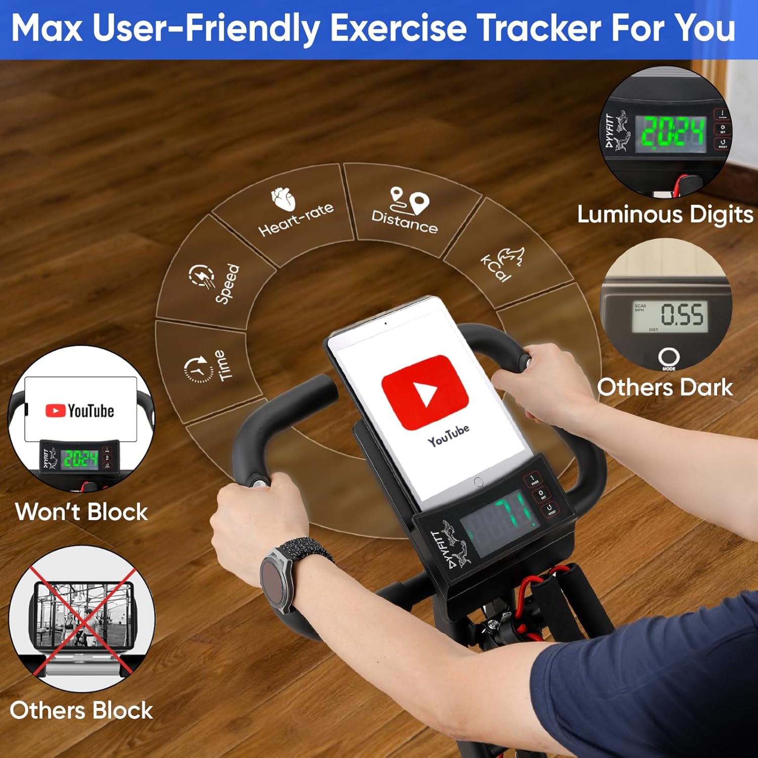 Unique Adjustable Show:Adjustable angle, you’ll be able to all the time in a position to alter to probably the most appropriate viewing angle in upright or recumbent sort; This show has 2 items design, you’ll be able to monitor your biking course of whereas use pill