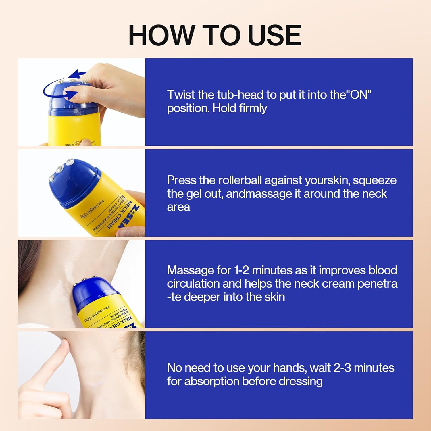 【Utilization Directions】 Rotate the cap on prime of the product to the “ON” place. Press the tube to dispense a small quantity of cream. Therapeutic massage the neck space utilizing the curler. After use, wipe off any remaining cream from the curler with a tissue. Lastly, rotate the cap again to its authentic place.